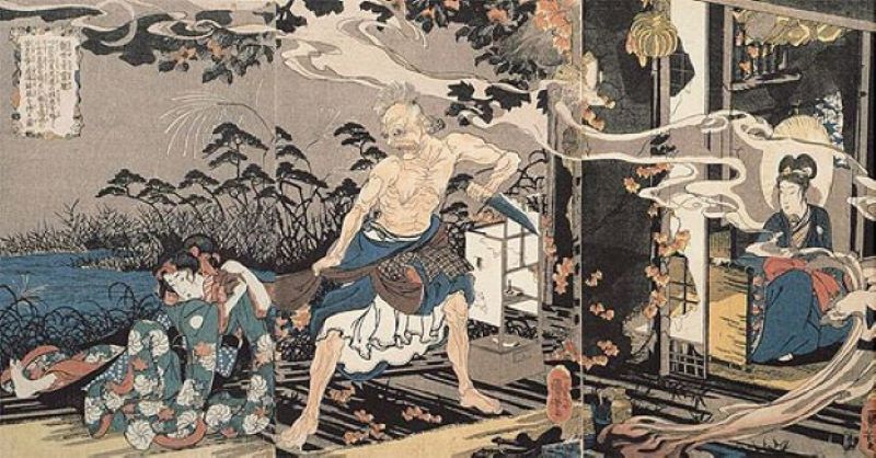 上の写真、歌川国芳作の「観世音霊験一ツ家の旧事」。