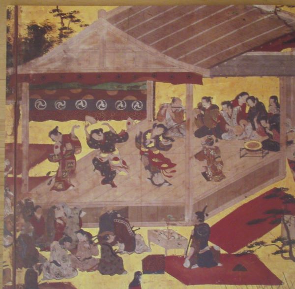 右隻と左隻の上方には、それぞれ<遊女歌舞伎>の芝居小屋。