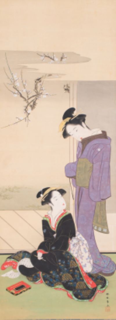 次いで、勝川春章作「梅花二美人図」