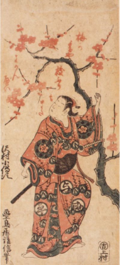 草色と紅色と墨の3板を重ね摺りした紅摺絵の役者絵。