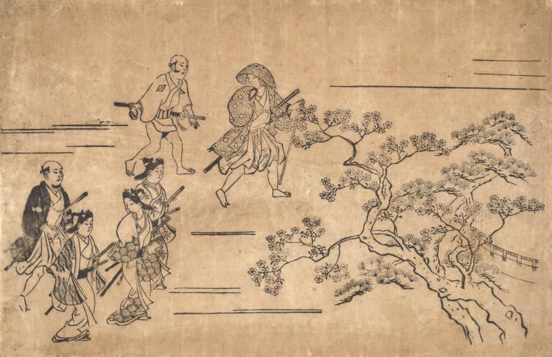 下、菱川師宣の墨摺絵 :「上野花見の躰 編笠武士と若衆」