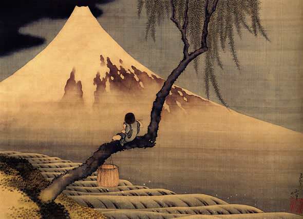 富士山に向かって木の幹に座り、笛吹く童子を描いている。