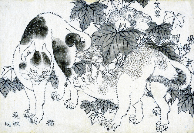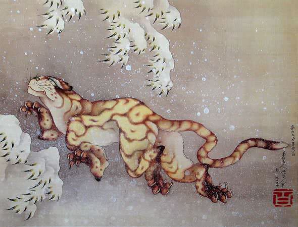 例② 「芙蓉 猫 花奴 同」は、二匹の猫の躍動感がいい。北斎は虎図をよく描いている。