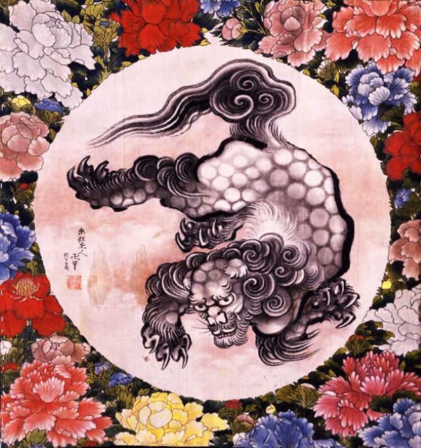 中央の唐獅子が北斎で周囲の花々が応為の絵になる。