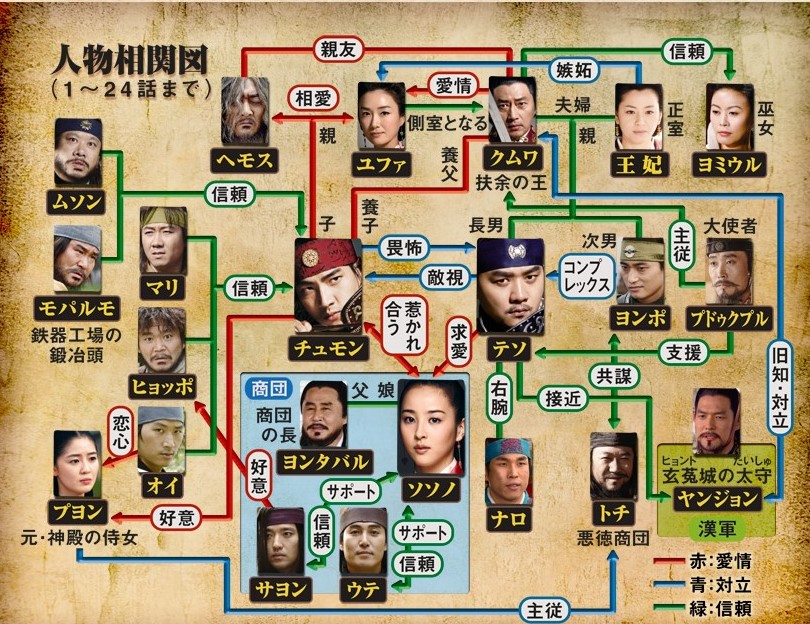 上の相関図では、ヨンタバル商団のサヨンとチュモンの部下ヒョッポの関係がおもしろい。