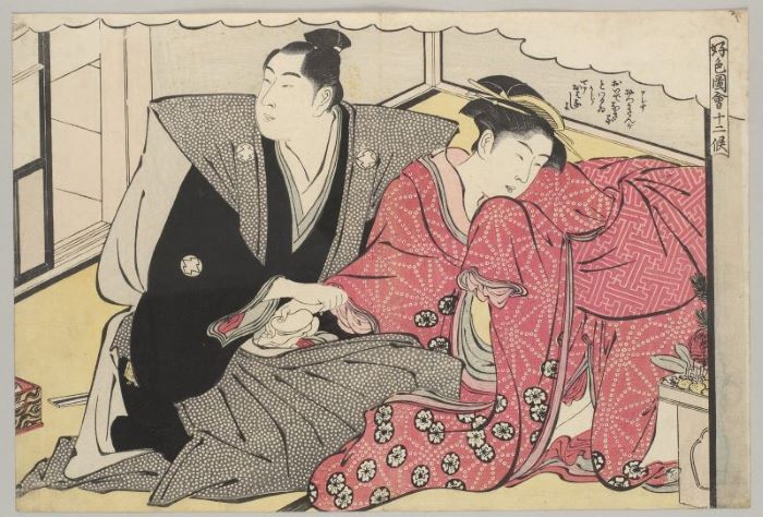 月代を剃ってない若者と大振袖の娘だから、14・5歳に満たない年頃(成人前)か。