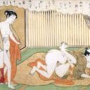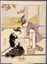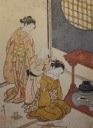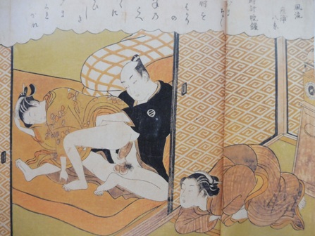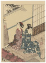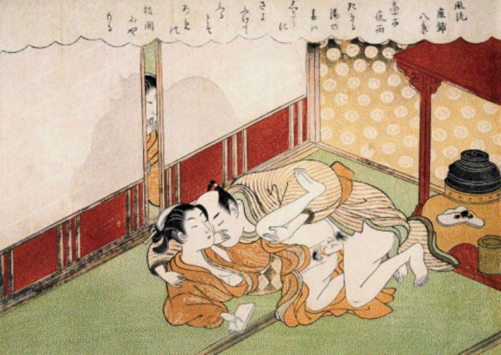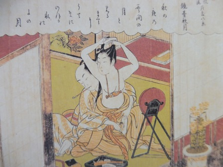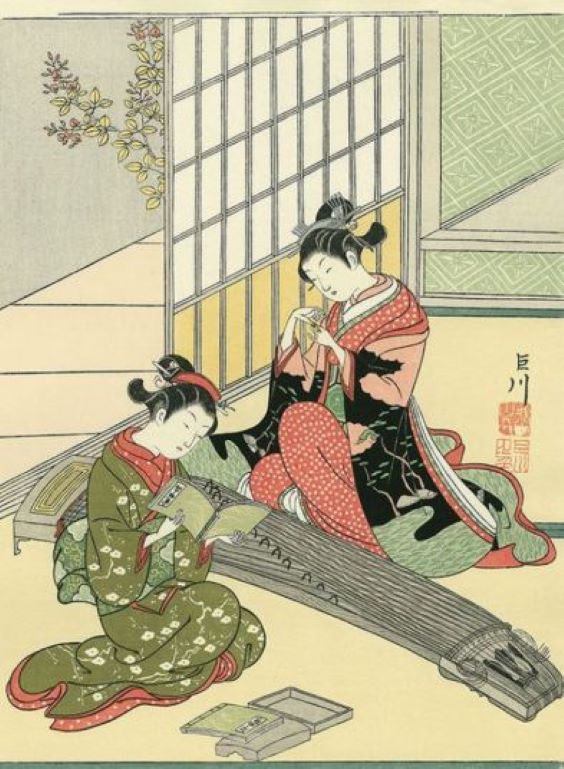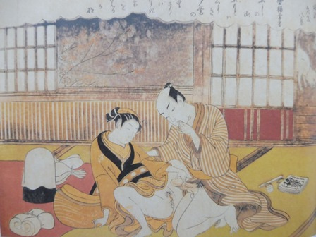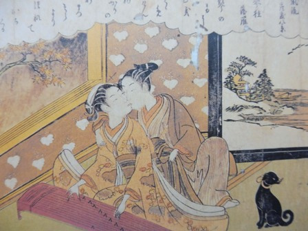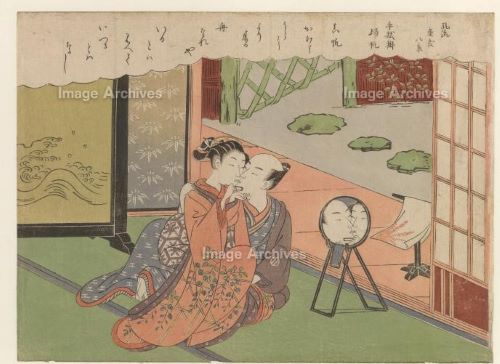 若い二人が仲睦まじくキスしている。琴の音に惹かれた二人の恋心を醸し出してるようだ。
