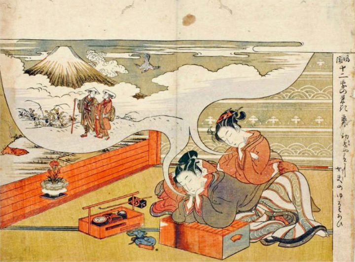二人で同じ夢をみる。初夢で縁起のいい「一富士二鷹三茄子」と鉢植えの福寿草(元日草とも)。