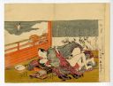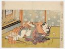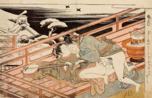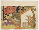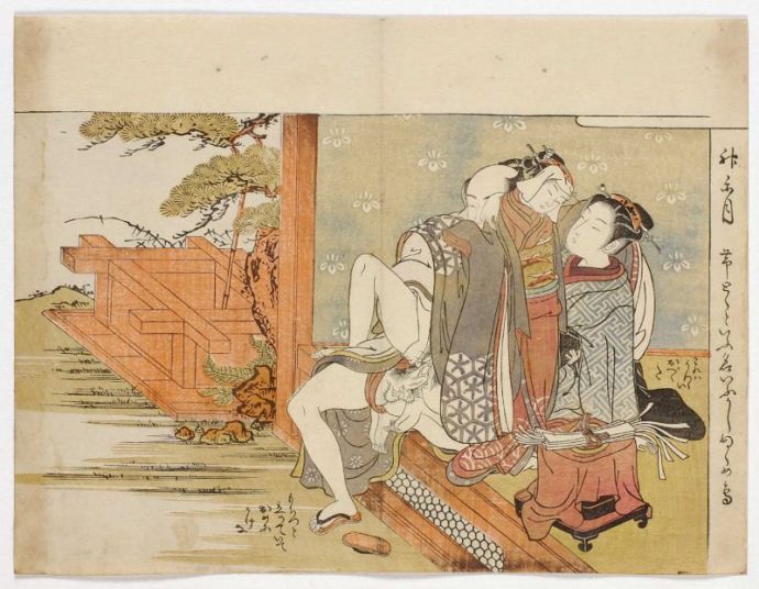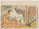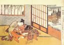 奉公人の若者が女房に後ろから迫り、彼の鼻息の荒さをたしなめている。