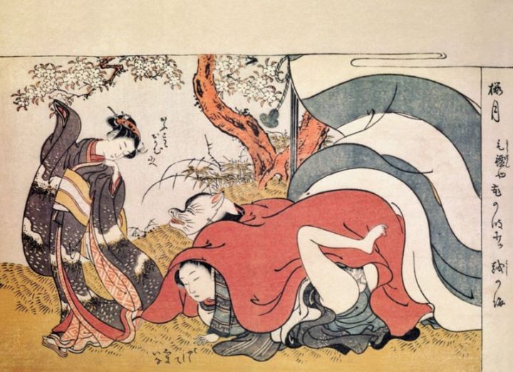 花見に幔幕を張り毛氈を敷いて、中で交合する男女。狐面の男が通りがかりの娘を怖がらせる。