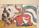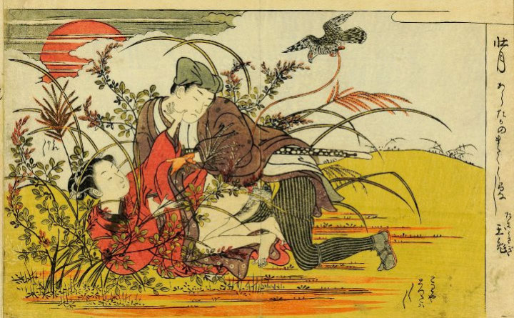 あらたかは鷹匠、玉兎は娘。鷹狩りに来て娘を手籠めに、娘はあらがう。玉兎は月の兎を指す。