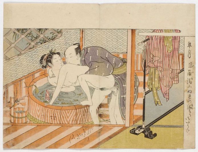 ぬれの縁は<濡れ>で風呂桶の濡れと性交の濡れ、ついりは入梅と男の露と懸けている。
