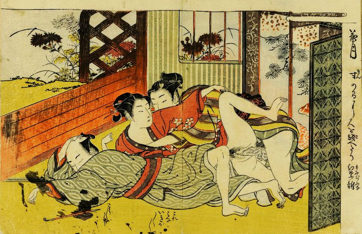 絵の書き入れは、<志ものく>は下の句、男女の秘所の掛詞。