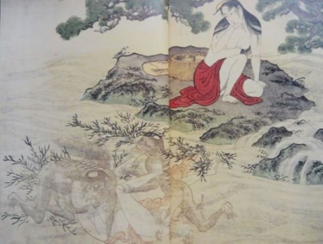 二匹の河童に、まさに犯されようとする女を岩場から見る海女。